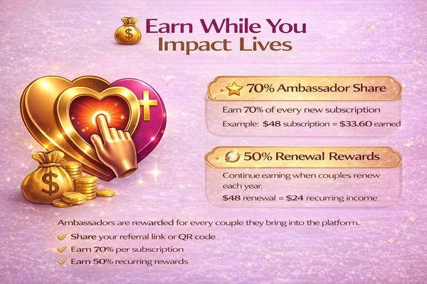 This program empowers ambassadors to help couples grow in communication, connection, and faith—while being compensated for the impact they create.